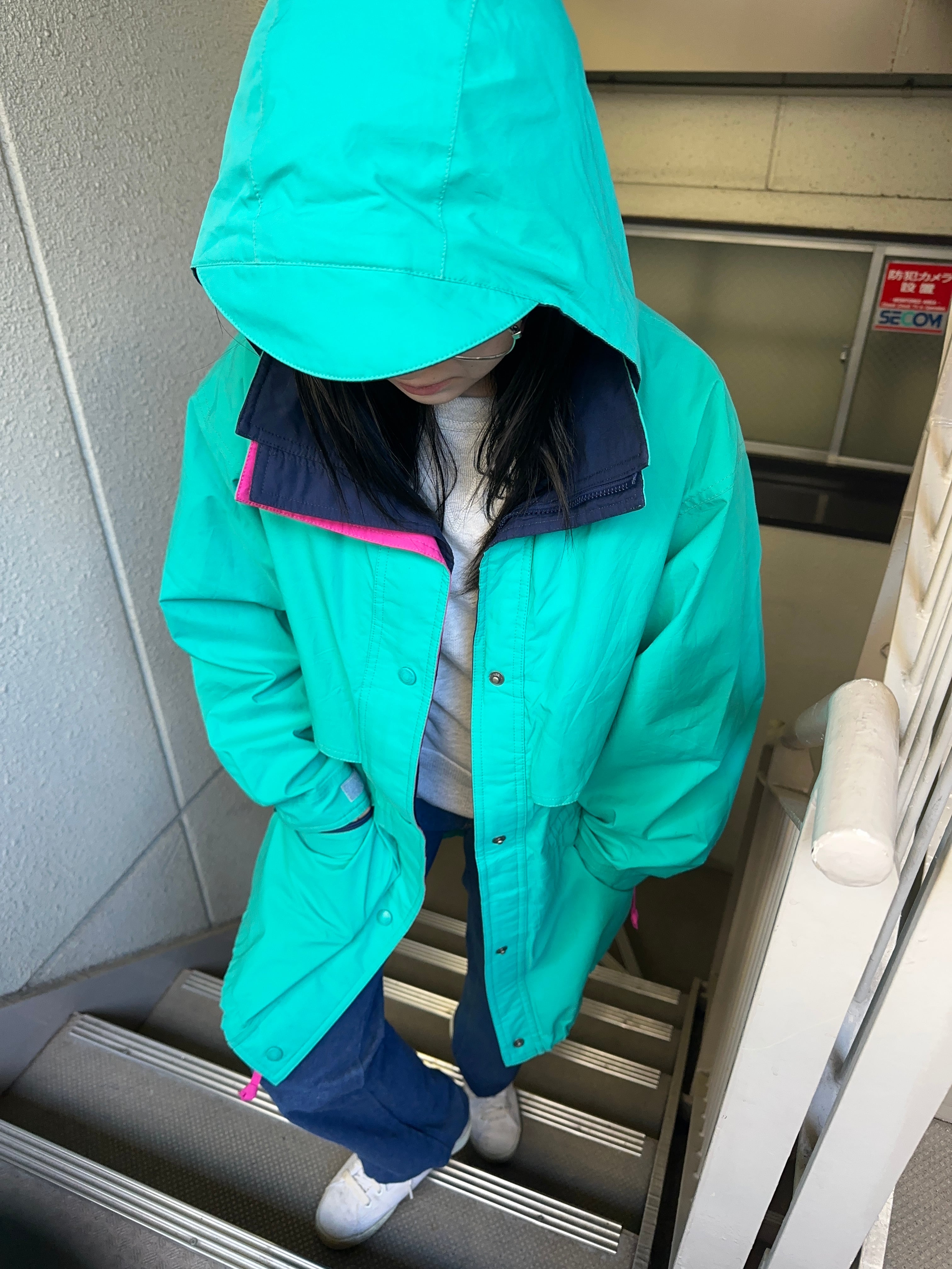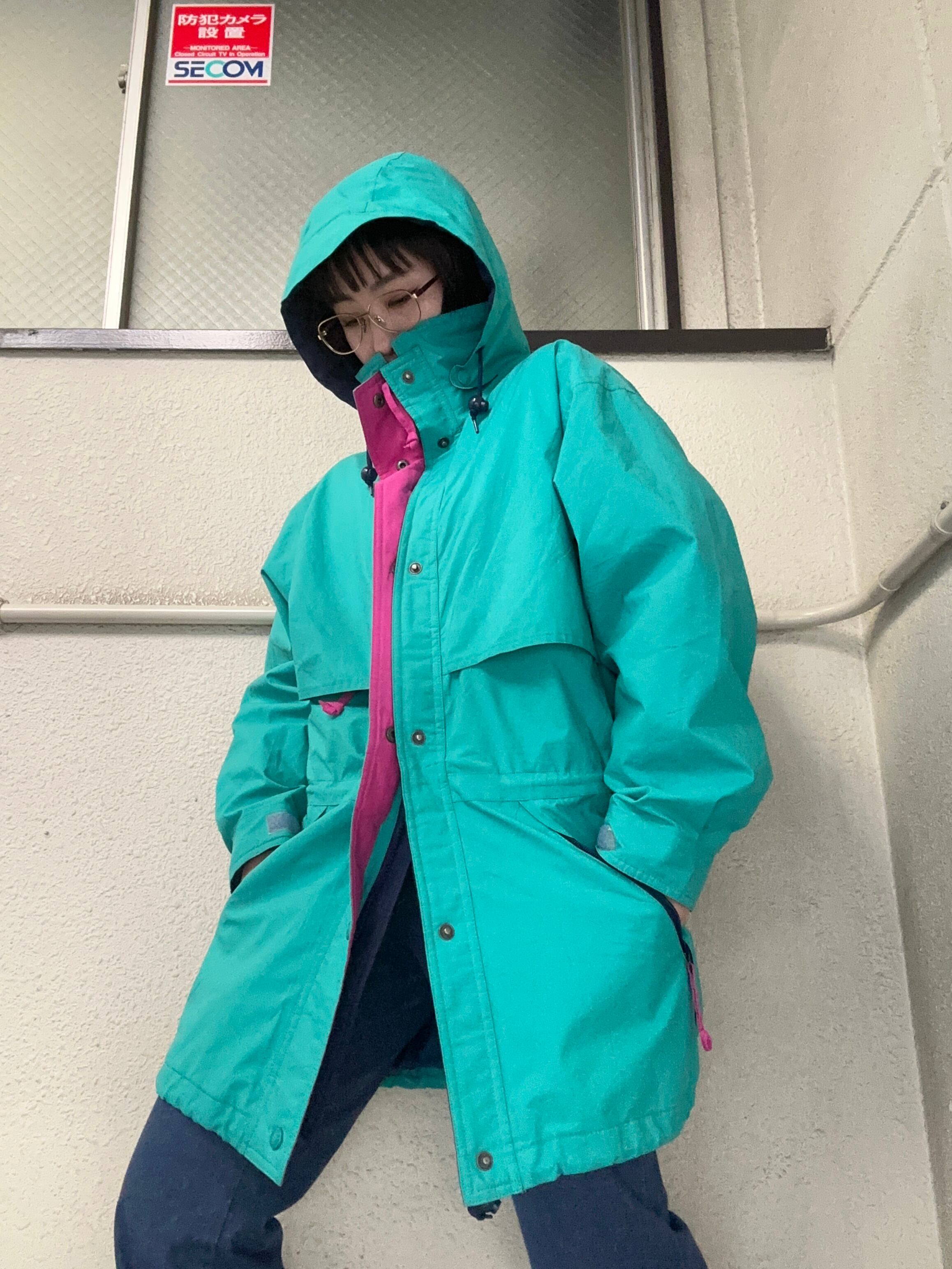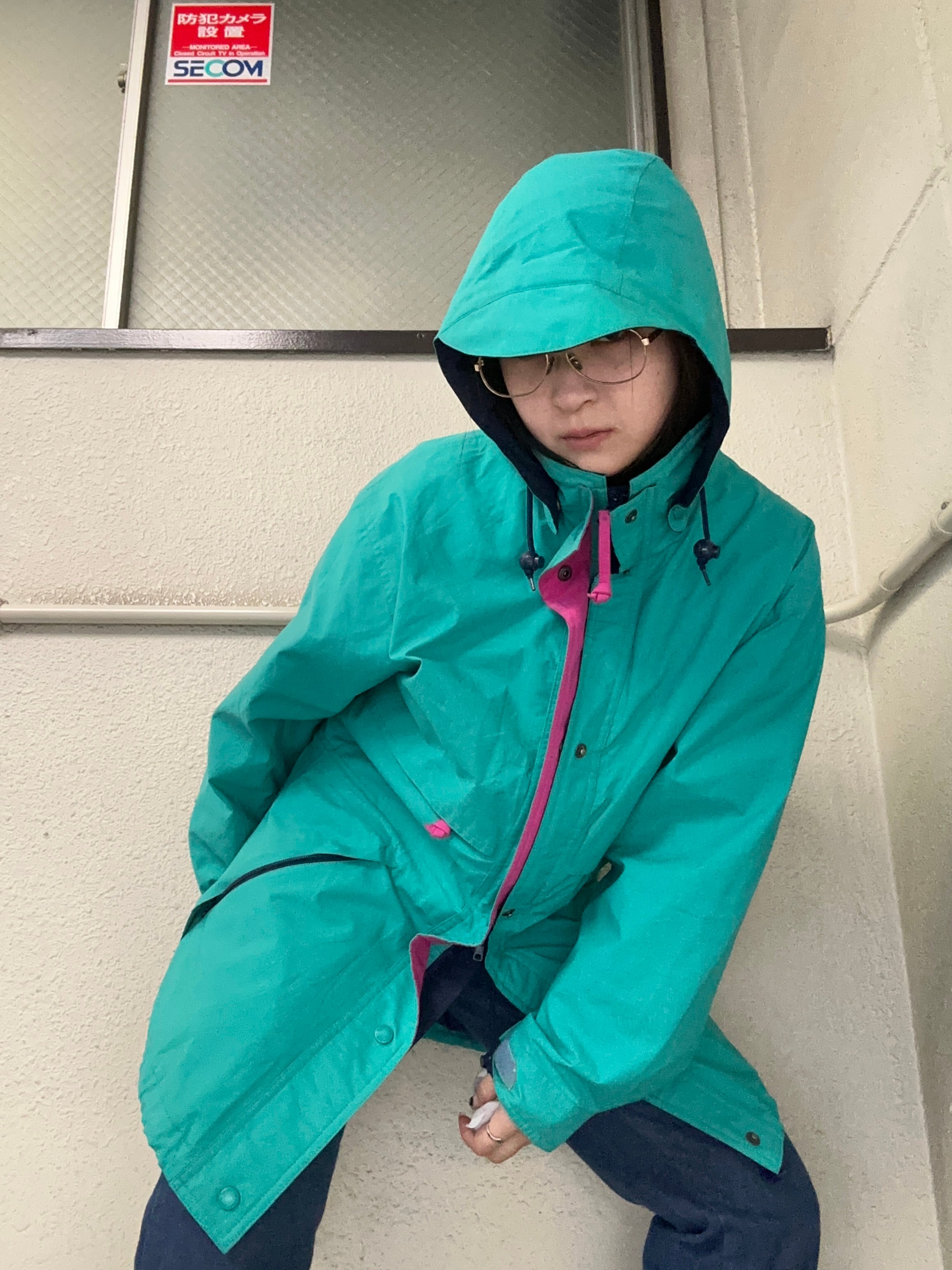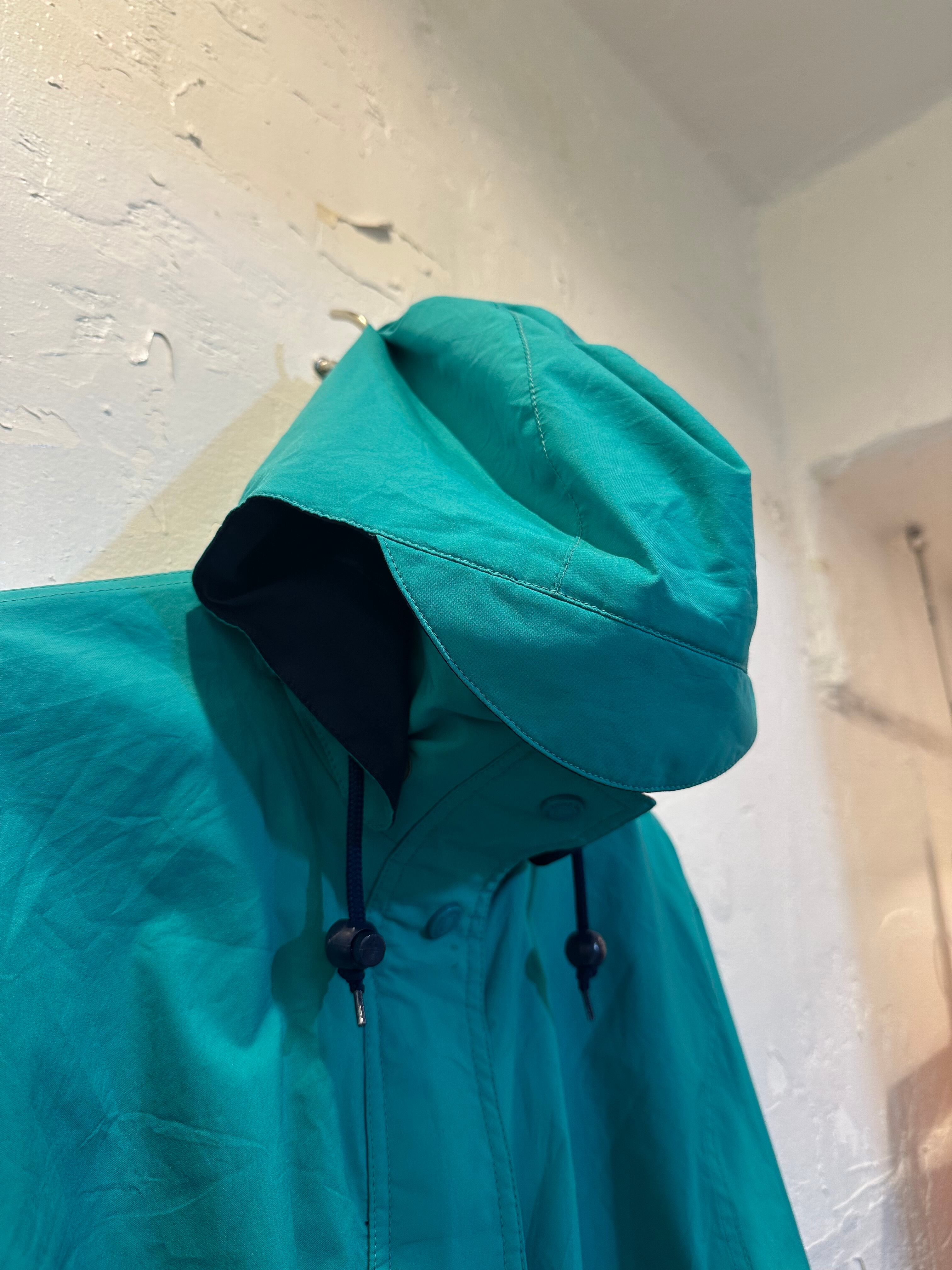 ドロコード、ハイネック、ツバ付きフード、ジップにスナップボタン、