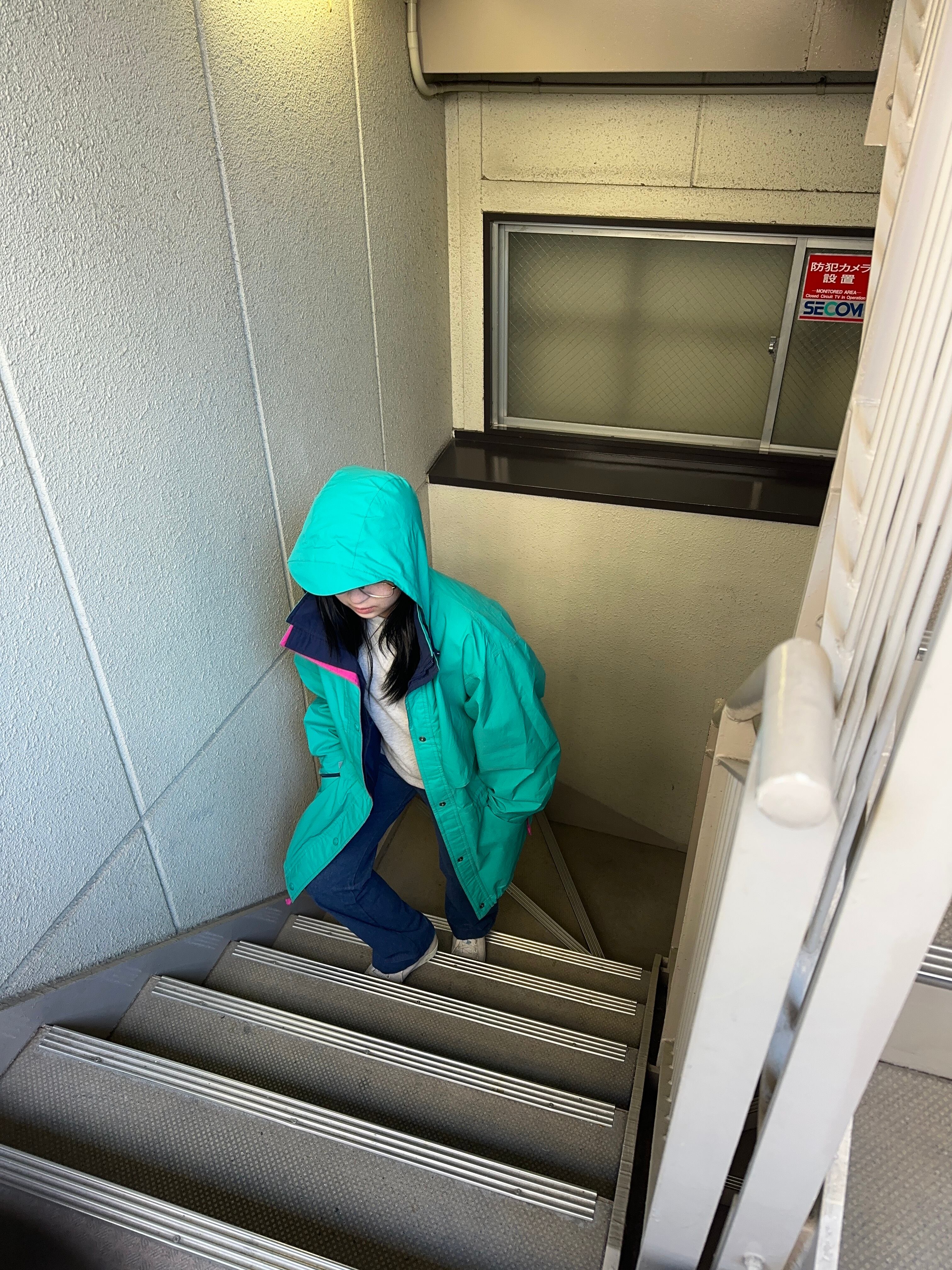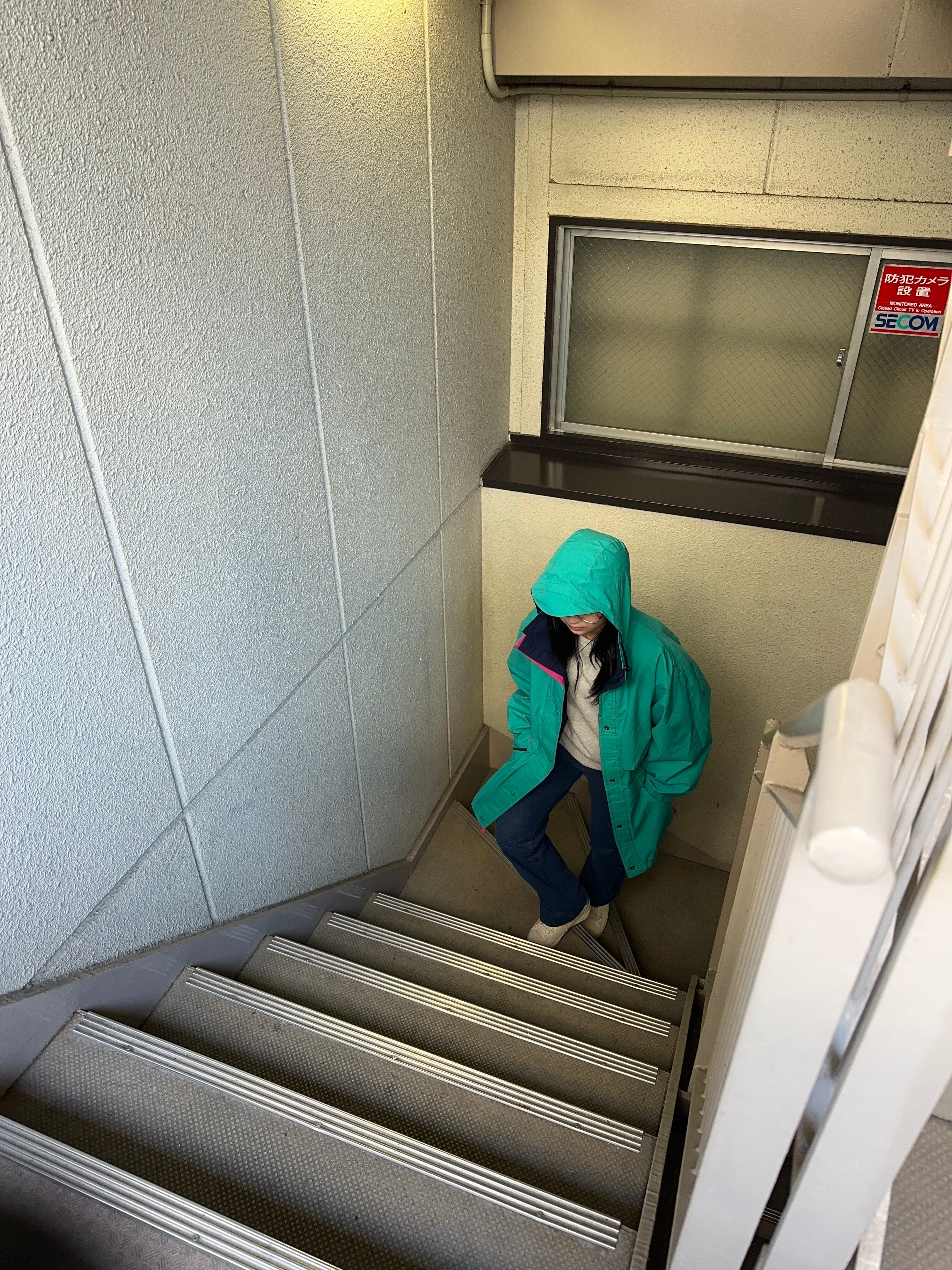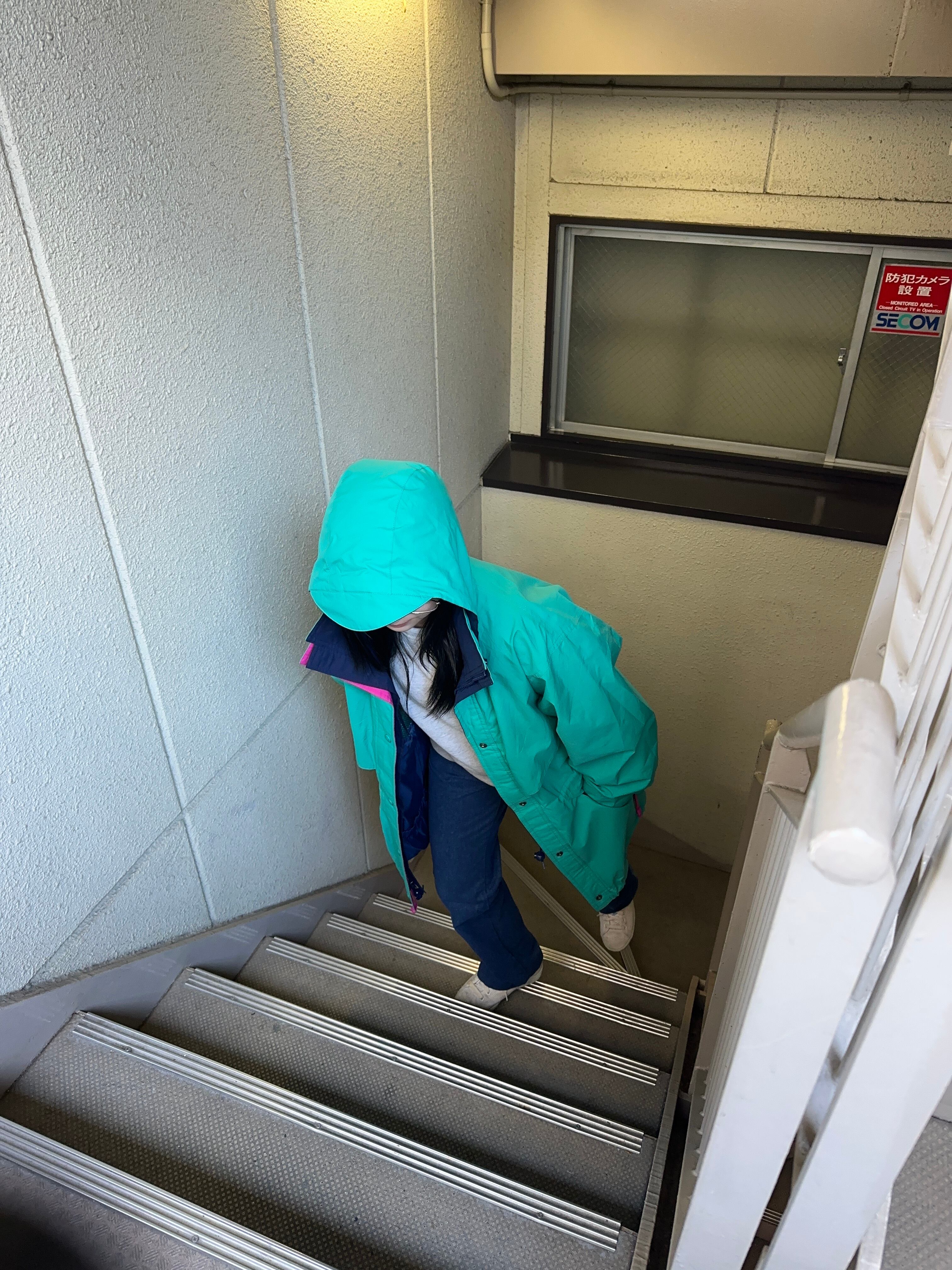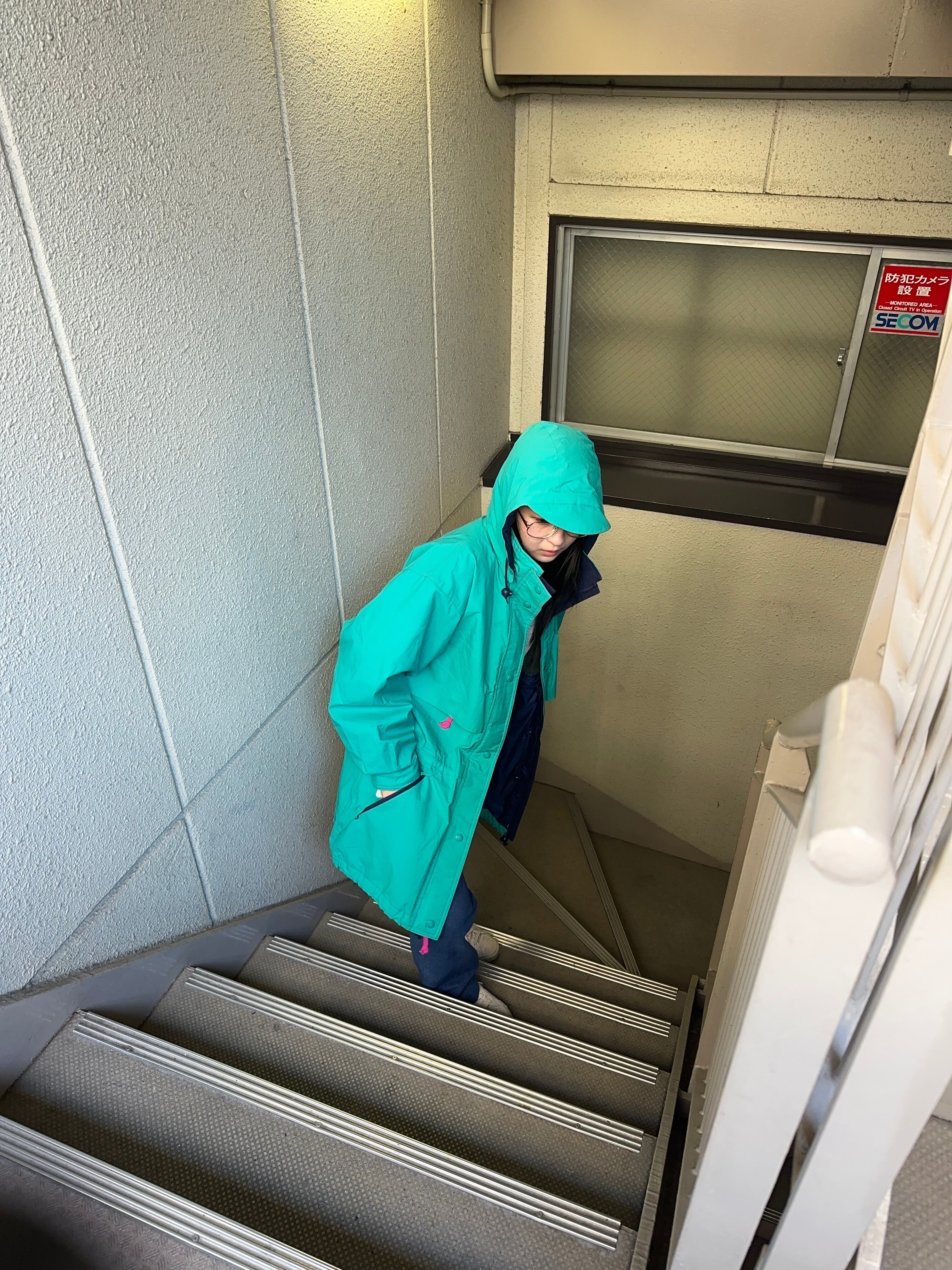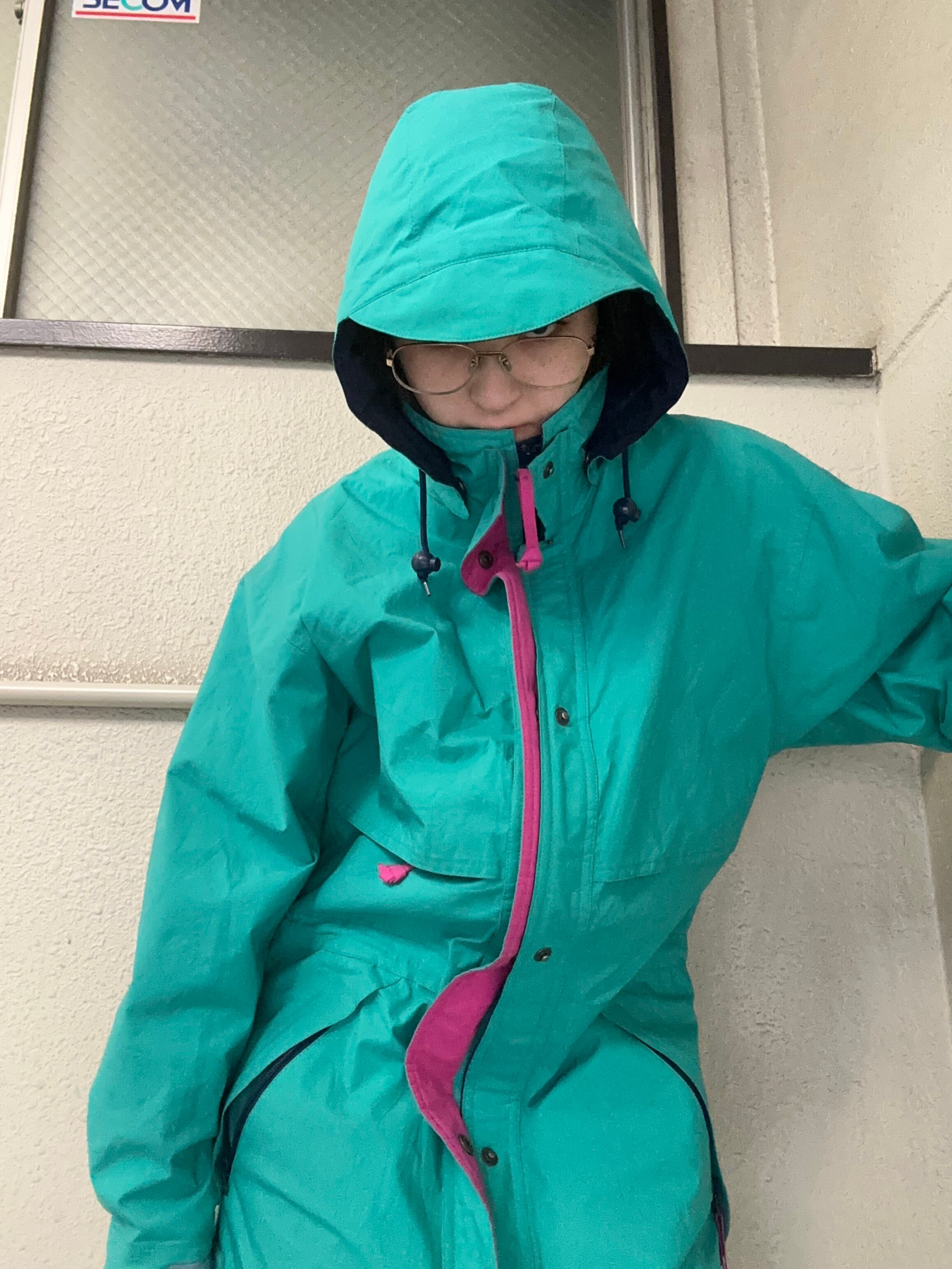 ドロコード、ハイネック、ツバ付きフード、ジップにスナップボタン、